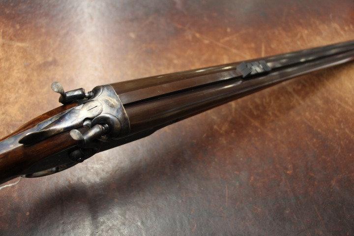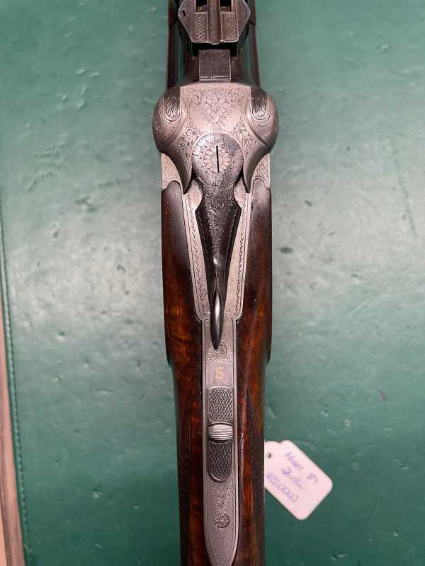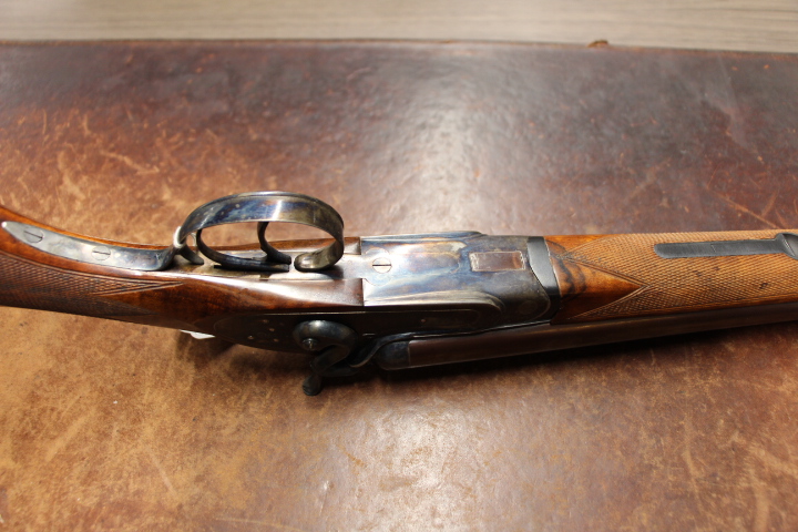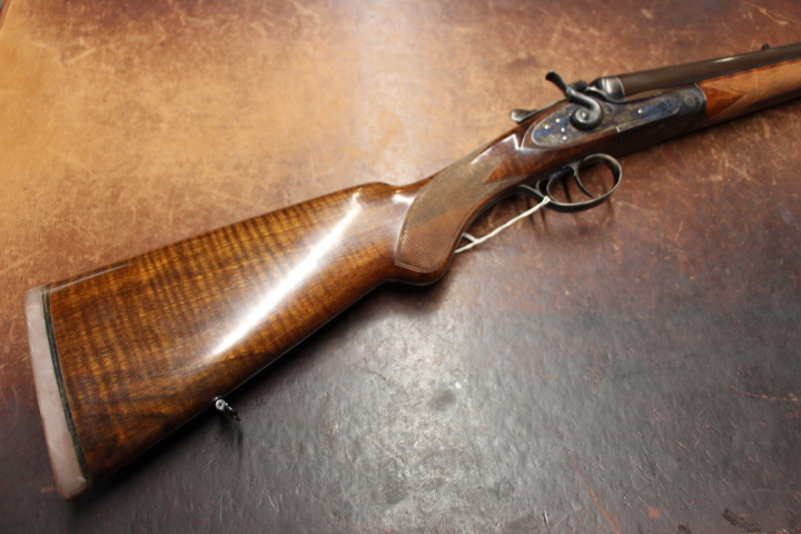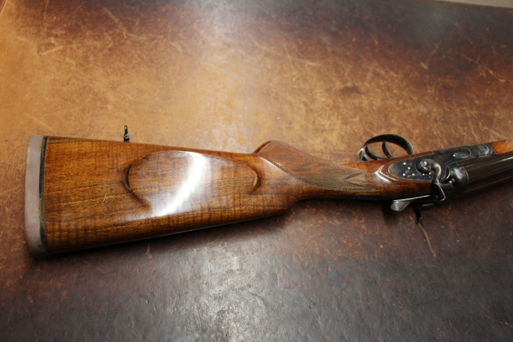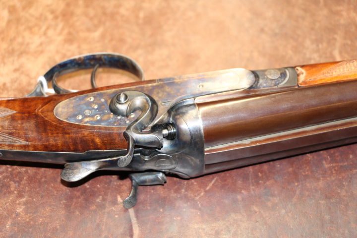 Wunderschöne Doppelbüchse, außen liegende Hähne, Safari Visierblätter, bunt gehärtet, bräunierte Läufe, 2599,-